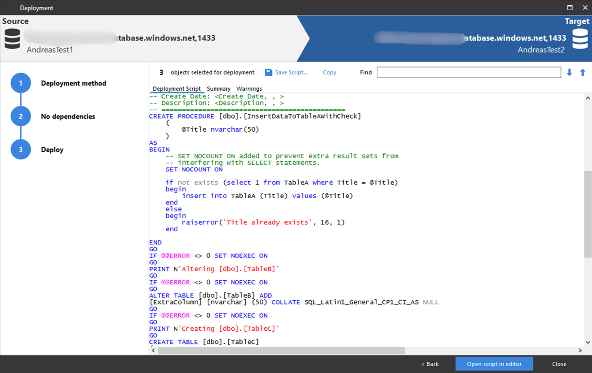 If there are any warnings (dropped data etc) you will see them first, if not it will show the «Deployment script». You can now review the script, as you should always do. If the generated SQL looks good you can copy for further use.