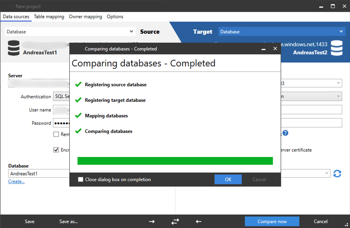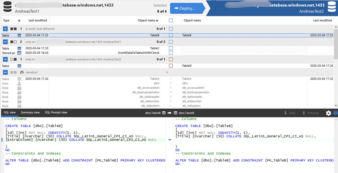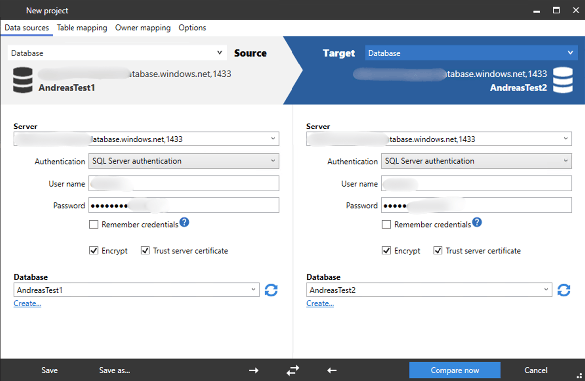 In this case we will connect to Azure SQL databases running in Azure, using SQL Server authentication. I have created two databases with similar, but not the same schemas.