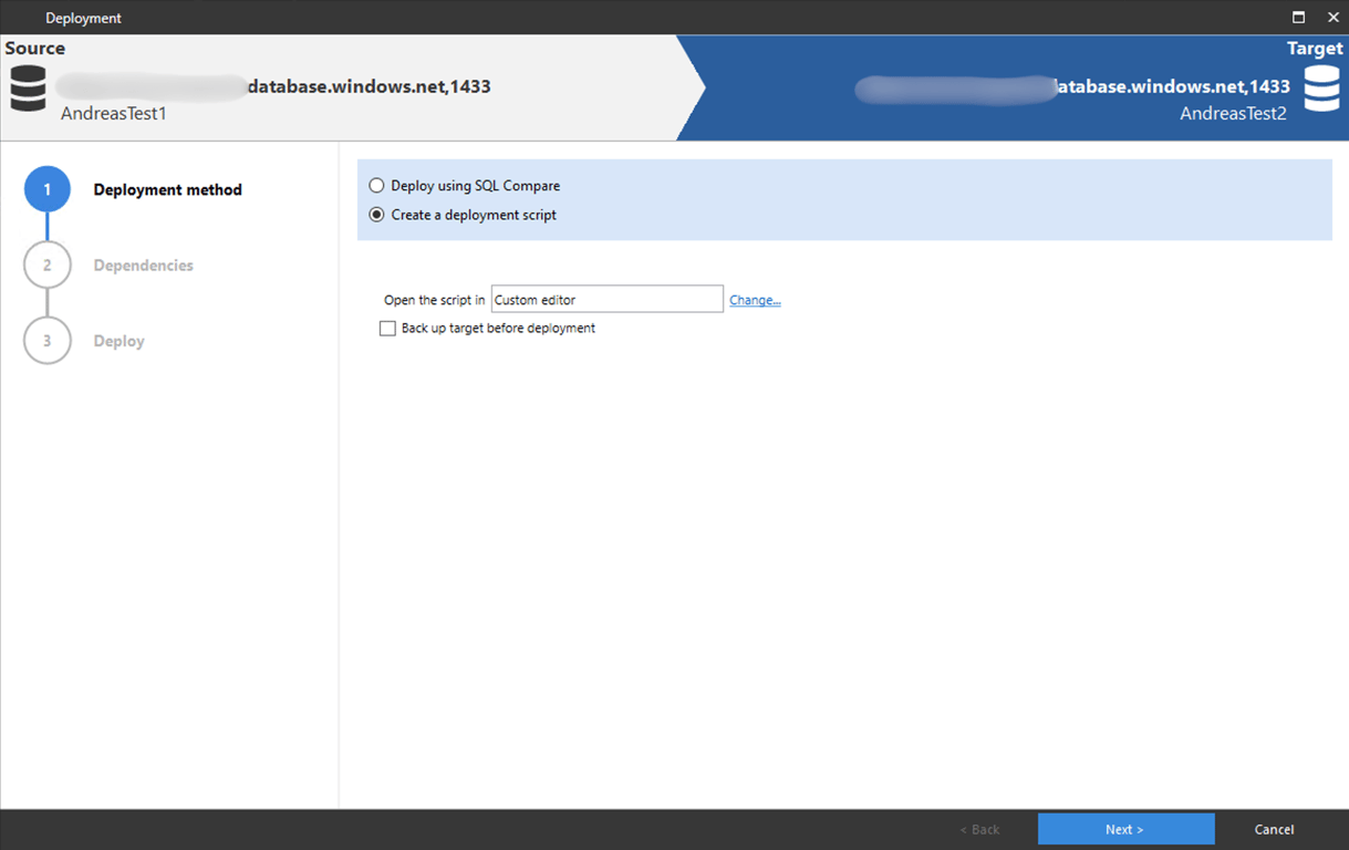 Now you have to decide on your method of deployment. For instant deployment choose «Deploy using SQL Compare». If you want to use the generated script in other ways (be it a deployment system, source control or deployment to multiple databases (RedGate Multiscript)) you will have to choose «Create a deployment script». You can also open the script in other programs, but I will show the built in editor.