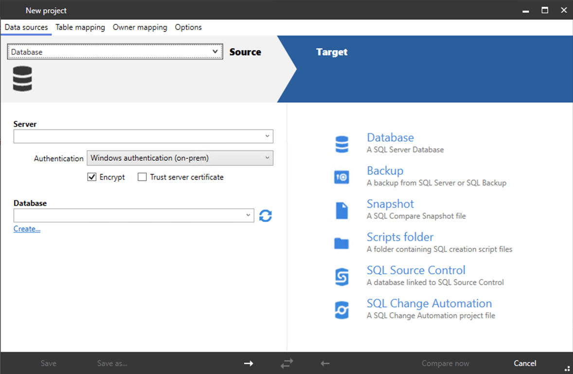 The first step is selecting your sources. Sources could be a database, be it Microsoft Sql Server, Azure Sql or others (check RedGate pages for full list). You can also compare backups, snapshots and scripts ++. I have only used it for database and backup comparisons, and it works like a charm.