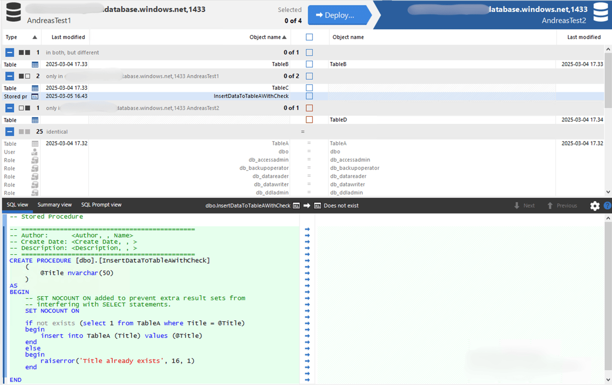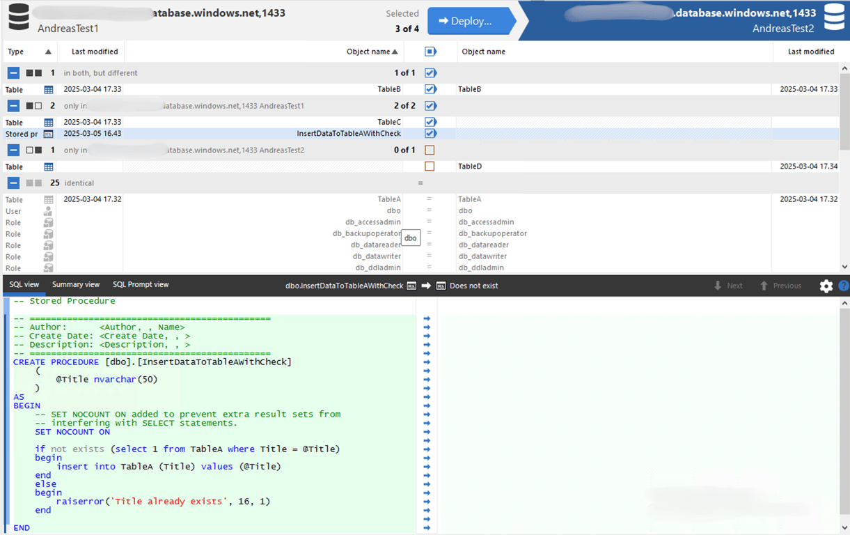 You can click on each difference/row to see the differences. When I click on InsertDataToTableAWithCheck we can see that it shows it as a «CREATE PROCEDURE» and displays the contents of the procedure.